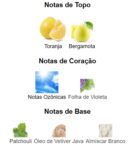 - Notas de topo:Toranja (grapefruit) e Bergamota
