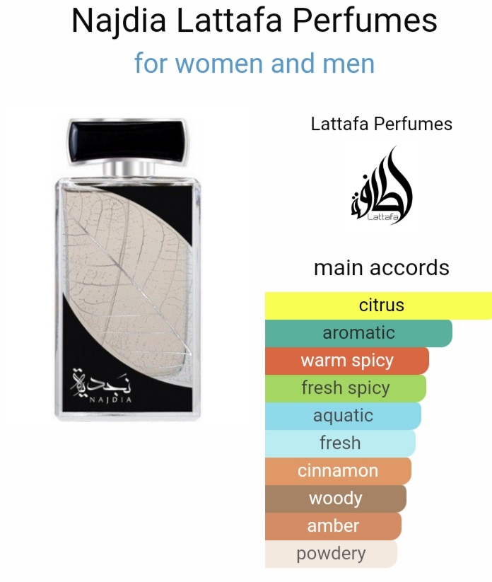 Najdia é uma fragrância unissexo que abre com frescura cítrica e frutada (limão, bergamota, maçã) combinada com especiarias como canela, sustentando um centro aromático aquático e herbal. A base assenta em madeiras, âmbar, tabaco e almíscar, conferindo-lhe profundidade e presença. Ideal para quem procura algo versátil, refrescante mas com carácter.