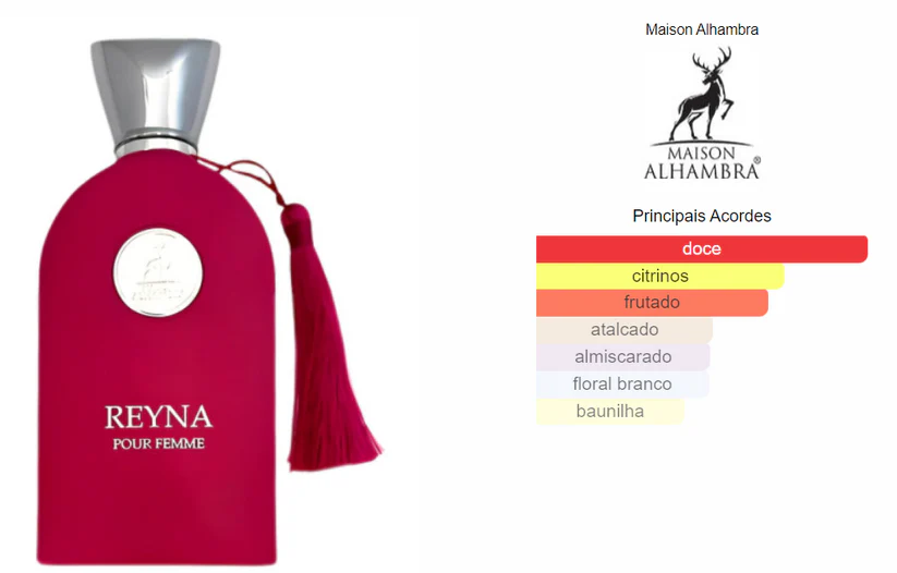 Reyna Pour Femme é uma fragrância feminina que celebra a alegria de viver e a feminilidade moderna com elegância e charme. A fragrância abre com notas cítricas vibrantes, evolui para um coração frutado-floral delicado e termina numa base doce, cremosa e envolvente, decorada com almíscares suaves. Ideal para mulheres que querem causar impacto com suavidade e carácter.