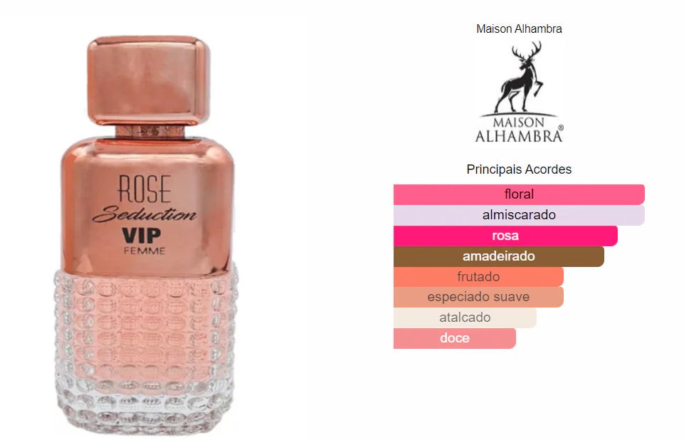 Rose Seduction VIP Pour Femme é uma fragrância feminina que celebra a feminilidade com um carácter elegante e divertido. Apresenta‑se com uma abertura efervescente e sofisticada, evoluindo para um corpo floral suave e encerrando numa base quente e envolvente que deixa um rasto memorável.