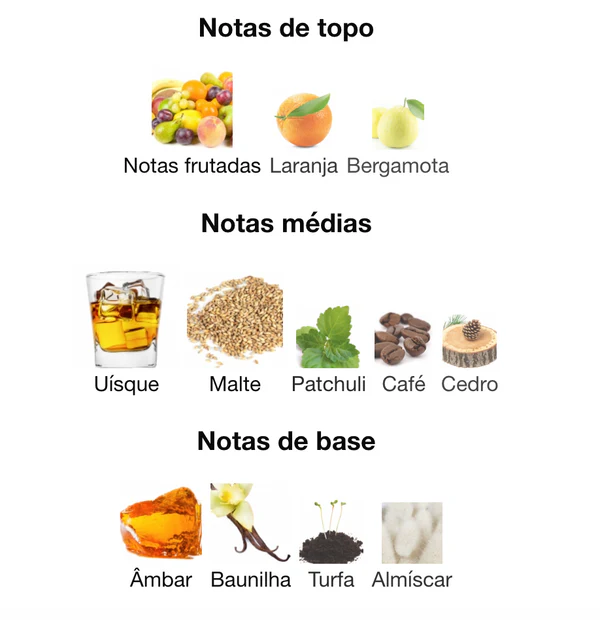 - Notas de coração: Whisky, Malte, Patchouli, Café, Cedro
